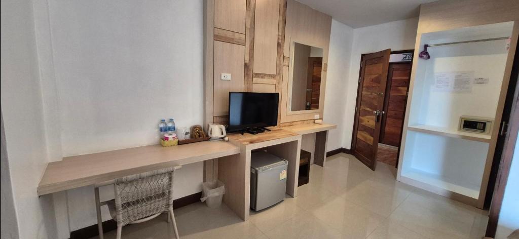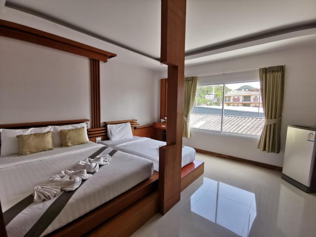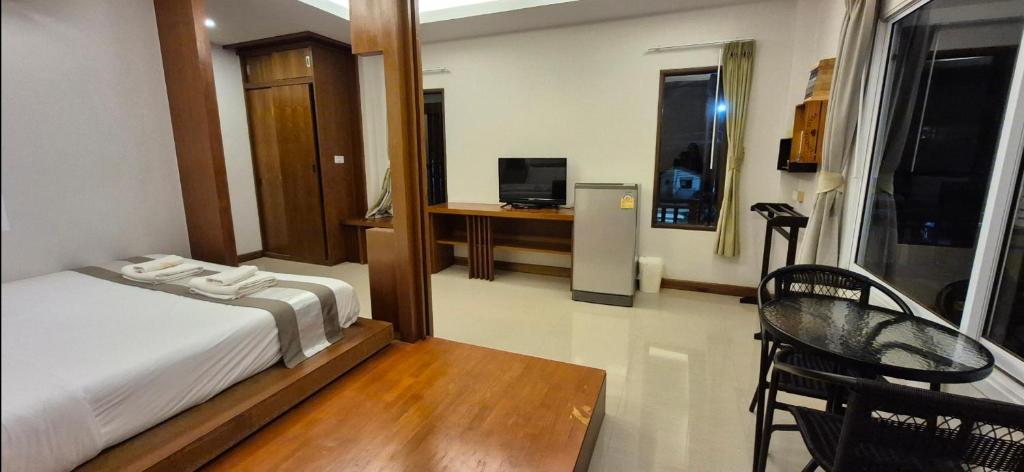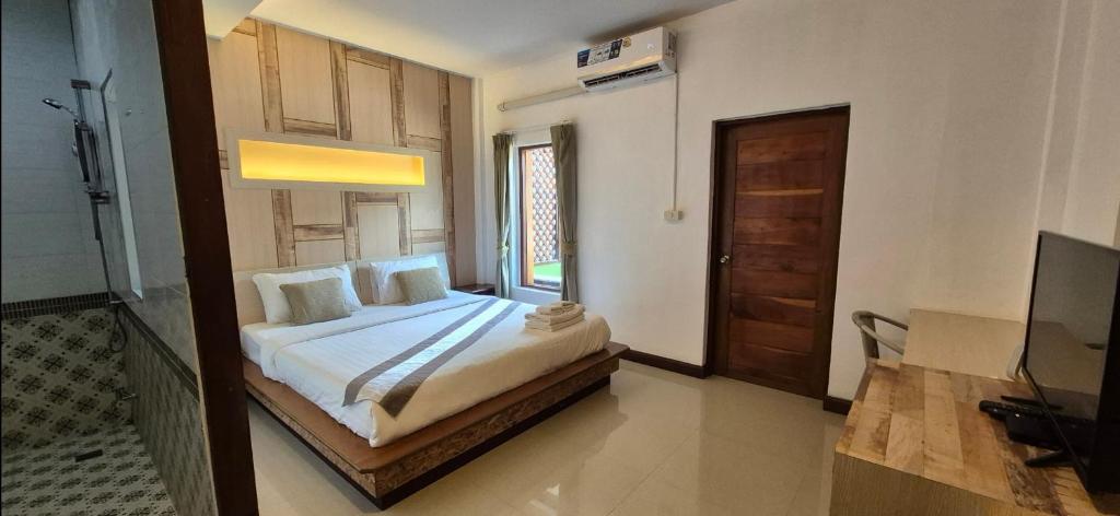 Pros: AC is great. Rooms are all good sized and new. The rooms and place are very clean. Quiet but we could hear the TV from the room next door. The women running it are really nice but not a lot of English. Cons: It's a few minutes to the beach but a dirty, trashy creek in back with a wood walkway with missing slats is your shortcut over it. The beach at that end has many boulders out under the surface of the water. Much better down the beach a bit. NO ROOMS have an ocean view, no matter what Agoda says. You can't see the water from any of them. Owners said that is a mistake. You just see other buildings and trees. The place is two story with about 9 rooms. The beds are hard, just like elsewhere in Thailand.